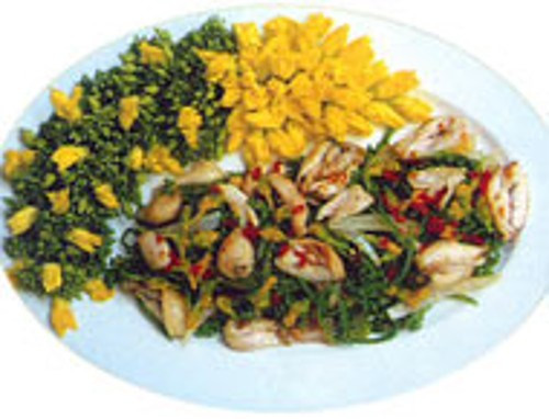 Hoa mướp xào mề gà. Đây là món ăn hấp dẫn, mang đậm hương vị dân dã. Mề gà rửa sạch với muối hạt, thái ngang miếng thành lát mỏng. Sau đó ướp mề gà với hành tím, gia vị, mắm, tiêu, bột ngọt. Ảnh: lamchame