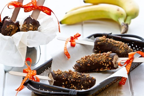 Kem chuối socola. Chuối bóc vỏ, dùng xiên theo chiều dọc quả chuối rồi cho vào ngăn đá. Khi chuối đã cứng lại, bạn đun chảy socola rồi nhúng từng que xiên chuối vào socola, sau đó lăn que kem vào đĩa đựng hạt điều nghiền nhỏ. Ảnh: Internet.