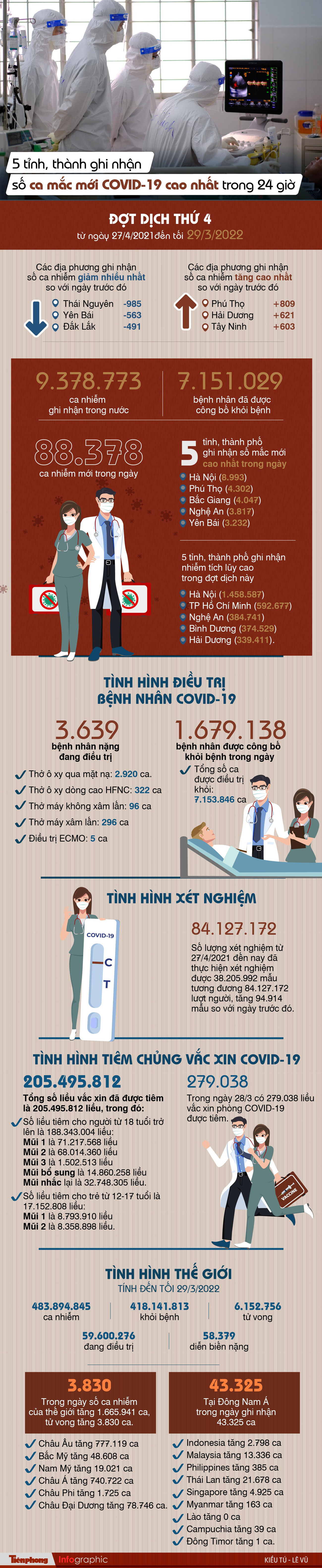 TPO - Kể từ đầu dịch đến nay Việt Nam có 9.386.489 ca nhiễm, đứng thứ 14/225 quốc gia và vùng lãnh thổ, trong khi với tỷ lệ số ca nhiễm/1 triệu dân, Việt Nam đứng thứ 121/225 quốc gia và vùng lãnh thổ (bình quân cứ 1 triệu người có 95.021 ca nhiễm).