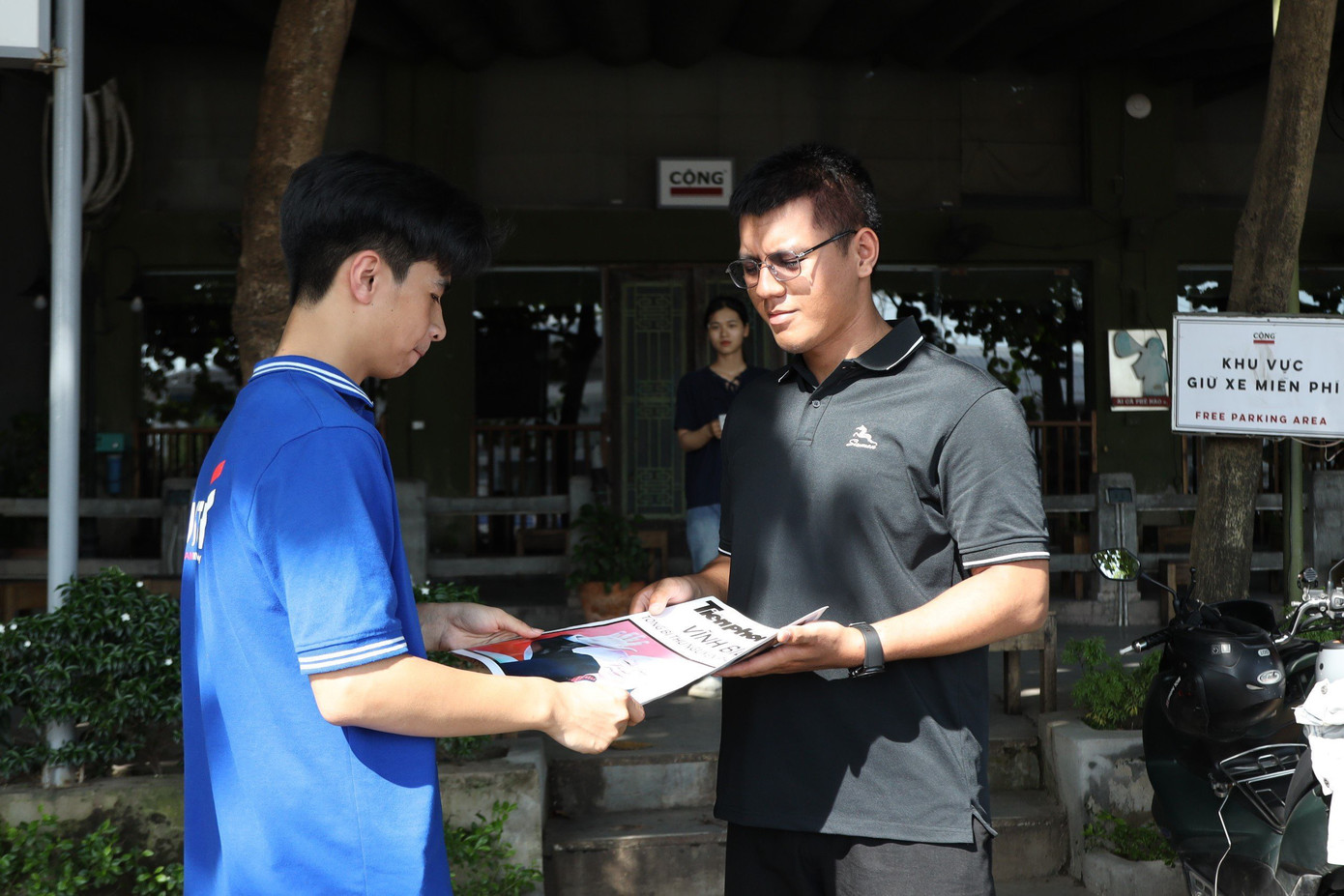 | Sinh viên USTH phát tặng báo tại khu vực gần sân vận động Mỹ Đình. |