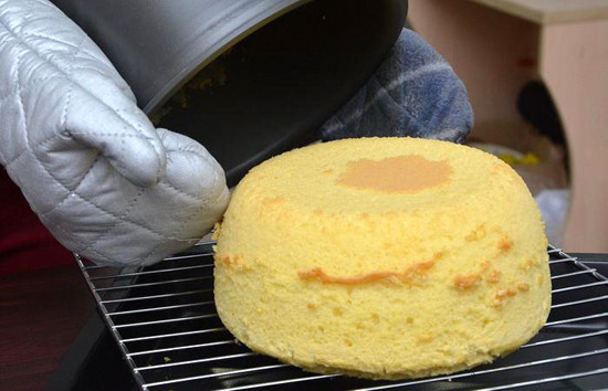- Lót dưới đáy nồi cơm điện một lớp giấy nướng hoặc một lớp bơ. Sau đó đổ hỗn hợp bột vào nồi, bật chế độ Cook. Nấu đến khi nồi chuyển sang chế độ Warm, để thêm khoảng 20 phút. Để kiểm tra bánh chín hay chưa nên dùng tăm xiên qua bánh, nếu tăm ướt, bật chế độ cook thêm lần nữa và tiếp tục nấu. Khi nào thấy bánh nở xốp là xong!
