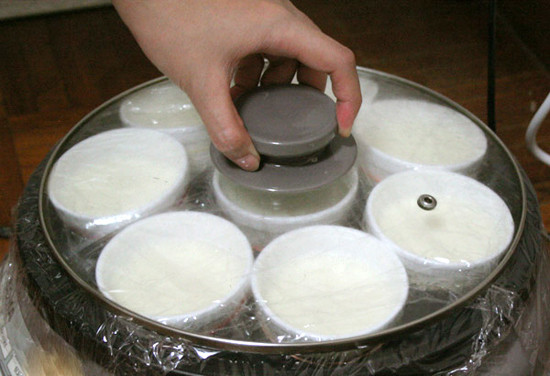 - Cho sữa chua ra hũ nhỏ, sau đó cho vào nồi cơm điện. Cho thêm nước ấm khoảng 45 độ C vào nồi, ngập khoảng 2/3 hũ sữa chua. Đóng nắp nồi cơm lại để ủ, để trong vòng 4-6 tiếng. Sau 2 tiếng, nên bật chế độ Warm của nồi cơm khoảng 15 phút để nước trong nồi không bị nguội đi. Tuy nhiên không nên bật quá lâu vì nếu nước bị nóng quá cũng ảnh hưởng đến chất lượng của sữa chua.