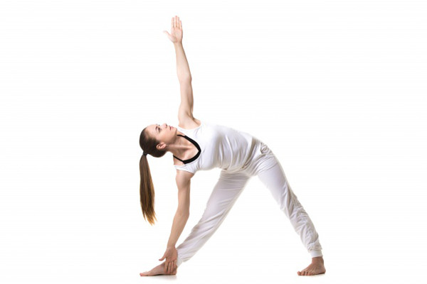 - Gập người, tay phải chạm vào bàn chân phải, tay trái đưa thẳng lên cao, mặt hướng về phía tay trái, hít vào.