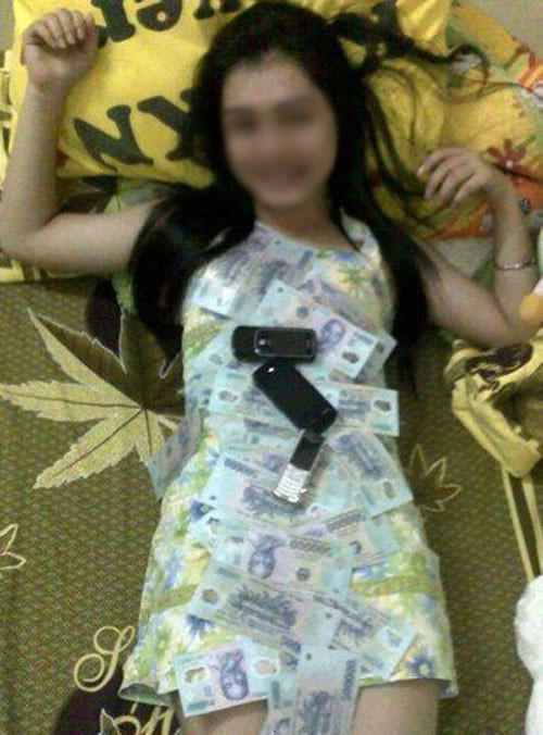 Trong ảnh, cô gái nằm dài và đắp lên mình hàng loạt những tờ tiền mệnh giá 500 ngàn đồng. Gây chú ý hơn cả là 3 chiếc điện thoại đặt trên người, trong đó có chiếc điện thoại Vertu giá khủng.