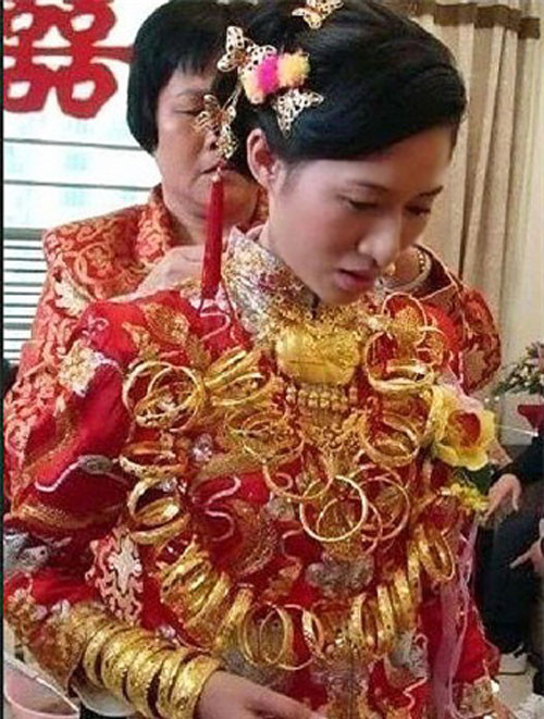 Số trang sức mà cô dâu này đeo khắp người bao gồm vòng xuyến, vòng tay, đồ chạm ngọc và nhẫn... Sự quan tâm mà ba mẹ cô gái dành cho cô dường như thái quá, khiến cô gái trong rất hợm hĩnh.