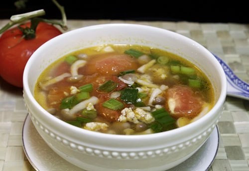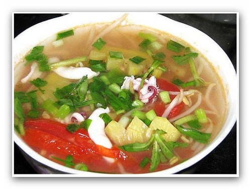 Canh mực chua ngọt với vị chua chua, ngòn ngọt tạo cho bạn cảm giác dễ chịu, ngon miệng hơn. Mực rửa sạch, băm nhuyễn rồi trộn đều với ớt, hành lá thái nhuyễn, hạt nêm. Đun sôi nước thì múc mực đổ vào, thêm chút đường cho ngọt. Nước sôi lại, cho cà chua và hành tây vào đun khoảng 2 phút. Múc canh ra bát, rắc thì là và hành lá thái khúc lên. Canh ngon hơn khi ăn nóng. Ảnh: hanhphucgiadinh