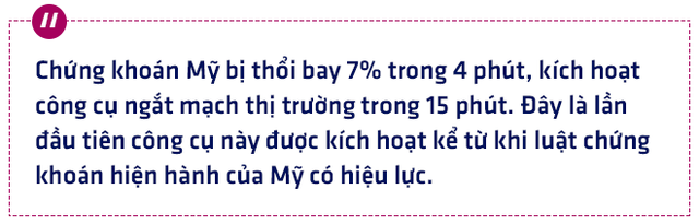 Khi tiếng chuông quen thuộc vang lên trên phố Wall, chẳng có gì giống những phiên giao dịch trước đó. Chứng khoán Mỹ bị thổi bay 7% trong 4 phút, kích hoạt công cụ ngắt mạch thị trường trong 15 phút. Đây là lần đầu tiên công cụ này được kích hoạt kể từ khi luật chứng khoán hiện hành của Mỹ có hiệu lực.