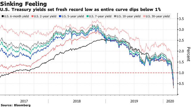 Cuối cùng, Dow Jones bị tắm máu. S&P 500 và NASDAQ cũng lâm vào tình cảnh tương tự. Chứng khoán và dầu đều rớt thảm hại, các nhà đầu tư hoảng loạn tìm đến những tài sản an toàn nhất. Tuy nhiên, lợi suất trái phiếu kho bạc kỳ hạn 10 năm của Mỹ đã thủng 1% khi người ta đổ xô săn lùng chúng. Đây là lần đầu tiên trong lịch sử có mức lợi suất này.