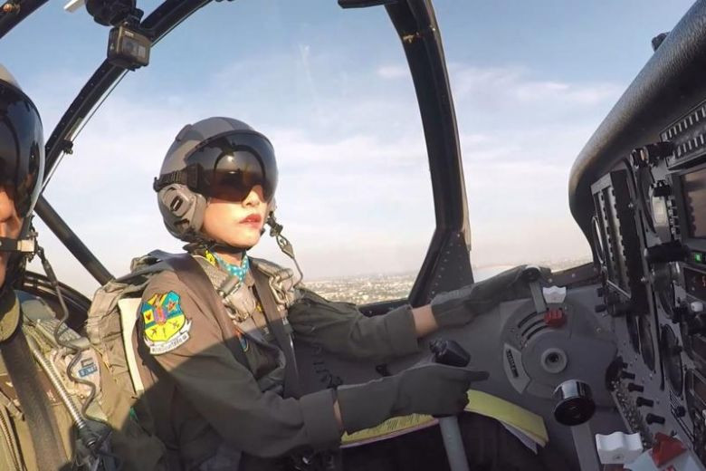 Cựu hoàng quý phi Sineenat Wongvajirapakdi trong trang phục lính dù trên máy bay. Ảnh: Văn phòng Hoàng gia Thái Lan.