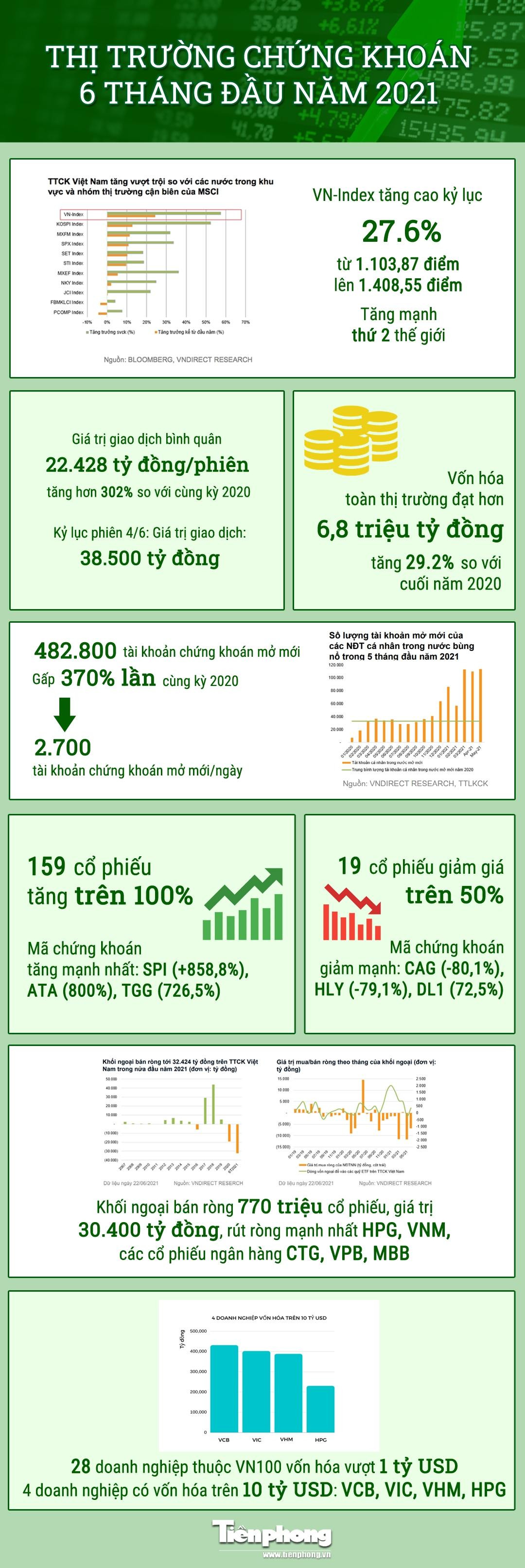 TPO - 6 tháng đầu năm 2021, những kỷ lục trên thị trường chứng khoán Việt Nam liên tiếp bị chính thị trường xô đổ. VN-Index là chỉ số chứng khoán tăng mạnh thứ 2 thế giới, thanh khoản trung bình phiên tăng hơn 300% so với cùng kỳ 2020.