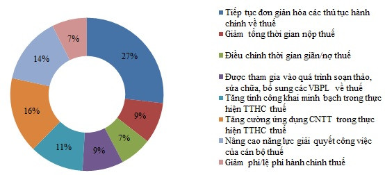 Trong rất nhiều yếu tố mà các Doanh nghiệp phản hồi mong muốn được cải thiện, dẫn đầu vẫn là những vấn đề liên quan đến đơn giản hóa thủ tục hành chính, với 27% số Doanh nghiệp bày tỏ mong muốn này, tiếp đó là sự tăng cường ứng dụng của CNTT trong các TTHC thuế với 16% số Doanh nghiệp lựa chọn ý kiến này. Nâng cao năng lực giải quyết công việc của cán bộ thuế; và tăng tính công khai minh bạch trong thực hiện TTHC thuế cũng là những yếu tố khiến các Doanh nghiệp chưa thực sự hài lòng với chế độ hiện hành của hệ thống thuế Việt Nam.