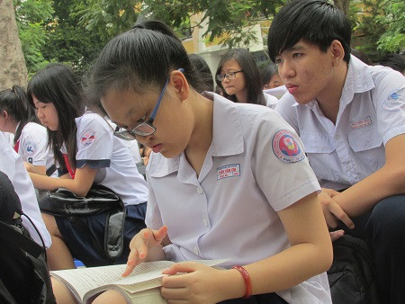 Nhiều học trò tranh thủ xem lại bài trong giờ khai mạc kỳ thi. Sáng nay, các em thi môn Ngữ Văn với thời gian làm bài 120 phút.