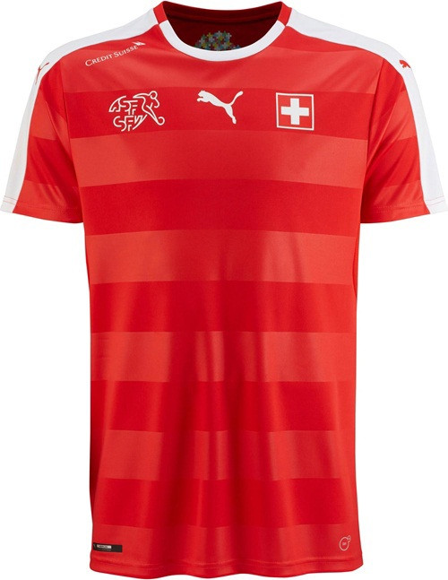 Đứng ở vị trí thứ bảy là áo của đội tuyển Thụy Sĩ gồm hai màu chủ đạo là đỏ và trắng. Trong lịch sử thi đấu, bộ đồng phục của họ đã trải qua nhiều lần thay đổi họa tiết, phom dáng. Áo các cầu thủ mặc tại Euro 2016 có những sọc ngang trên nền đỏ nhưng quá chìm, khiến trang phục trơ một màu đỏ nhàm chán.