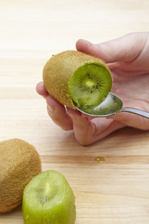 Gọt kiwi không hề dễ dàng bởi phần lông tơ trên vỏ có thể dính vào phần thịt quả và gây ngứa lưỡi khi ăn. Do đó, bạn có thể dùng dao cắt một đầu của quả kiwi rồi dùng thìa kim loại khéo léo xoay xung quanh phần thịt quả để tách vỏ dễ dàng.