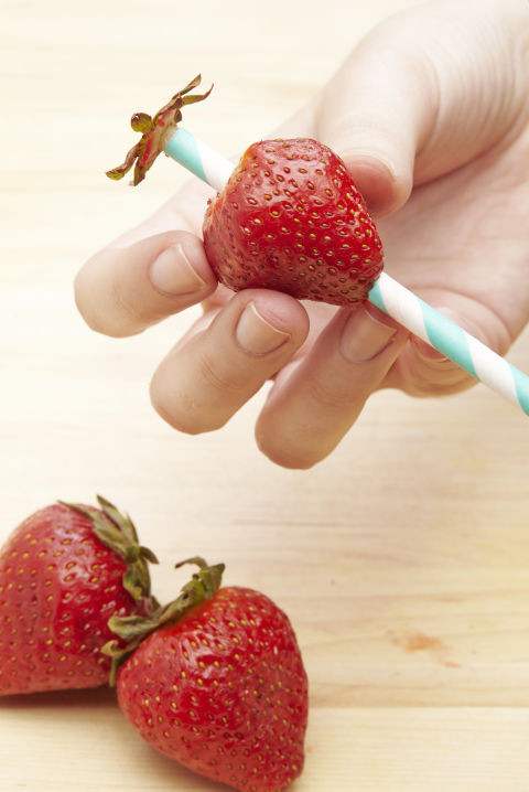 Thay vì phải dùng dao, bạn có thể sử dụng một chiếc ống hút xuyên qua quả dâu tây để loại bỏ phần cuống.