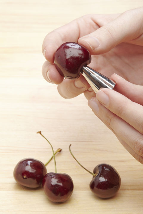 Bạn có thể dùng đầu nhỏ của đui bắt kem để loại bỏ phần cuống của quả cherrie.