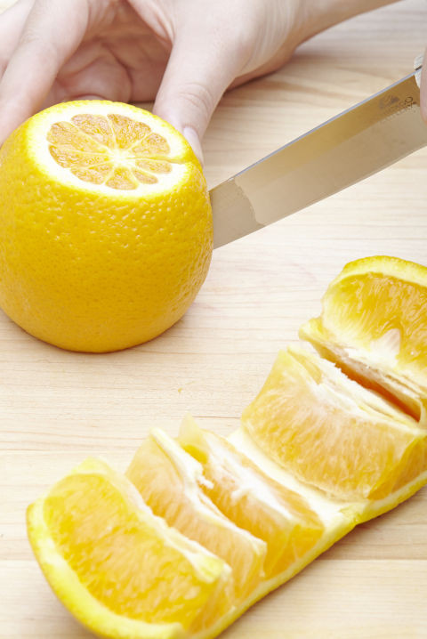 Nếu muốn bóc cam nhanh chóng, hãy cắt bỏ hai đầu của quả cam rồi dùng dao cắt dọc một đường sâu vào tận lõi. Sau đó, dùng hai tay tách quả cam và kết quả là bạn sẽ có một hàng múi cam đều tăm tắp.