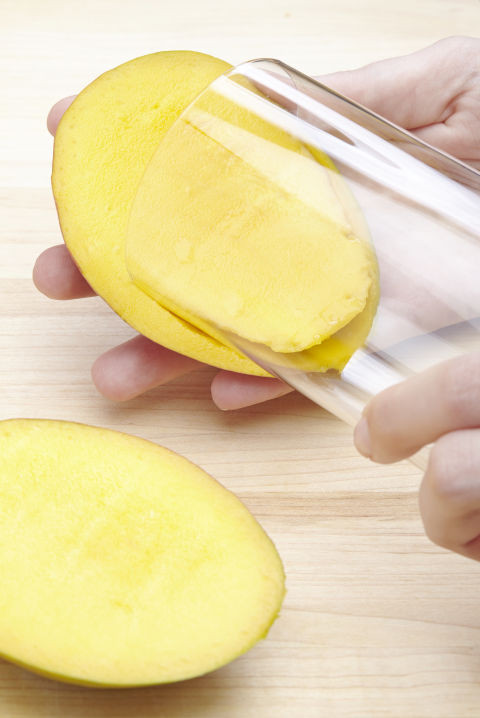 Thay vì gọt bằng dao, bạn có thể dùng cốc thủy tinh để lột vỏ phần má xoài. Tuy nhiên, để hiệu quả và dễ dàng hơn, bạn nên sử dụng cốc thủy tinh mỏng thay vì cốc dày.