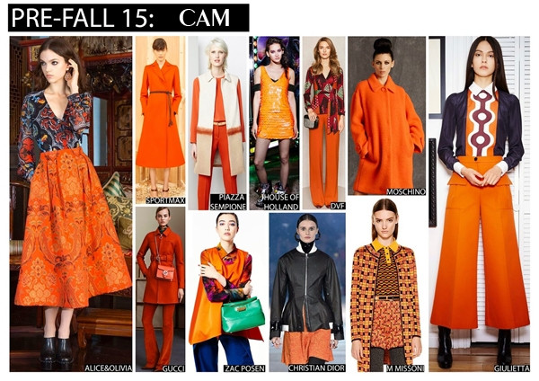 Sắc cam không chỉ thịnh hành trong mùa thời trang Xuân hè vừa qua mà còn tấn công các bộ sưu tập Pre-Fall. Các chuyên gia nhận xét, màu cam không hề dễ mặc vì kén da và có thể gây sự xung đột trong phong cách nếu mix non tay. Tuy nhiên, sự rực rỡ, sống động của nó đã hấp dẫn hàng loạt nhà tạo mốt. Alice & Olivia mang đến thiết kế pha trộn họa tiết thanh lịch, trong khi áo khoác Moschino cam đậm giúp các quý cô ấm áp, sang trọng. Dior, Gucci hay Zac Posen đều hào hứng tham gia trào lưu.