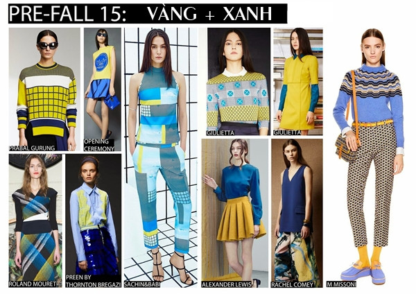 Thời trang giao mùa năm nay có một điểm mới, đó là sự nở rộ của những bộ cánh pha màu vàng và xanh. Bộ đôi sắc màu tạo nên sự tươi mới với cách hòa trộn đa dạng theo kiểu color block hoặc xen lẫn họa tiết. Một điều bất ngờ là Prabal Gurung, Sachin & Babi hay Preen... đều phối chúng cùng họa tiết kẻ ô đầy hiện đại. Một số nhà thiết kế khác kết hợp hai tông màu này cùng cảm hứng cổ điển thập niên 70.