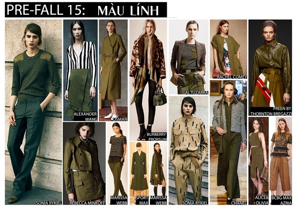 Màu lính vẫn xuất hiện lác đác trong các bộ sưu tập mùa trước nhưng không mạnh mẽ, rõ rệt. Đến mùa này, nó được ứng dụng rộng rãi. Cả những hãng đính đám như Burberry Prorsum, Alexander Wang và Chanel đều gửi gắm vào loạt thiết kế Pre-Fall. Màu lính đi kèm style quân đội khiến trang phục trở nên thời thượng, cá tính. Dù là quý cô công sở hay tín đồ thời trang đường phố cũng có thể lựa chọn những món đồ xanh rêu sành điệu, hợp mốt năm nay.