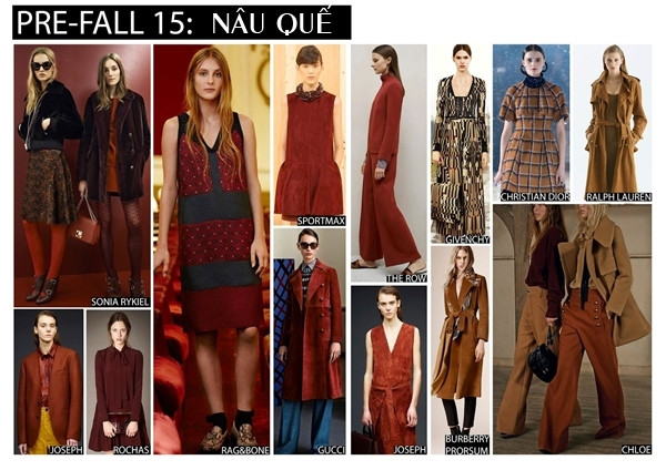 Bảng màu nâu với tông nâu quế, nâu đỏ nhạt, lạc đà (camel) được áp dụng trên nhiều trang phục mỗi mùa lạnh, trong đó, nâu quế lên ngôi mạnh mẽ trước thềm thu đông năm nay. Sonia Rykiel, Chloe, Sportmax chung ý tưởng phối tông màu này cùng những gam nồng ấm khác nhằm xua tan giá lạnh cho phái đẹp ngay từ vẻ ngoài. Gucci lại mix cùng gam xanh, trong khi Joseph thêm nét tươi mới bằng sắc vàng.