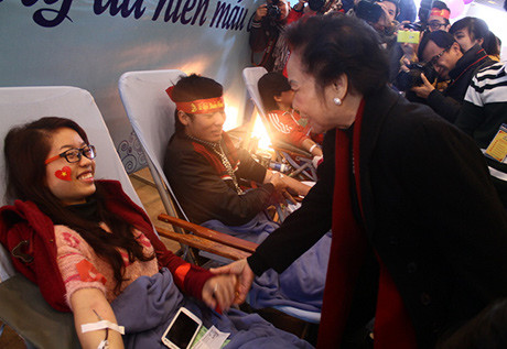 700 cặp đôi tay nắm tay, trao giọt máu thiện nguyện Phó Chủ tịch nước Nguyễn Thị Doan thăm hỏi, động viên các bạn trẻ hiến máu tại lễ hội Xuân hồng 2014