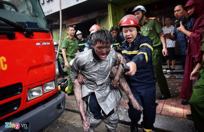 Trong vụ hỏa hoạn xảy ra ở cửa hàng quần áo trên phố Núi Trúc (Hà Nội) ngày 10/9, hình ảnh trung úy Vũ Ngọc Hoàng (26 tuổi, quê Đông Anh, Hà Nội) gương mặt đen sạm, người ướt sũng cõng em Nguyễn Hoàng Giang (18 tuổi) khỏi đám cháy khiến nhiều người xúc động. Khi được phát hiện ngất xỉu ở tầng 4 ngôi nhà đang cháy, nạn nhân Giang được đại úy Nguyễn Trung Hiếu - đội trưởng Đội Cảnh sát PCCC quận Ba Đình - và đồng đội nhường bình oxy, tiến hành sơ cứu, rồi nhanh chóng đưa ra ngoài. Ảnh: Phạm Thắng.