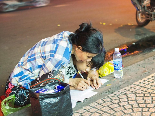 Ngày 26/4, hình ảnh một người phụ nữ cầm tay cậu bé để uốn nắn từng nét chữ, lấy vỉa hè làm bàn học ở Sài Gòn khiến nhiều dân mạng xúc động. Theo tìm hiểu của Zing.vn, người phụ nữ trong ảnh là dì ruột của bé Trần Hoàng Bảo (10 tuổi). Bảo cùng mẹ và dì ruột không có nhà cửa, phải lang thang bán rong ở khắp các con đường quanh chợ Bến Thành, những nơi có quán ăn, chỗ đông người. Cậu bé không được đi học vì không có giấy khai sinh và giấy tờ tùy thân. Ảnh: Bùi Xuân Vũ.