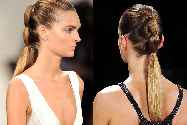 Vẫn là kiểu tóc đuôi ngựa nhưng bạn thử sáng tạo theo cách này xem sao. Đầu tiên, hất toàn bộ tóc về phía sau, chia làm 3 phần, dùng dây thun cột chặt phần tóc thứ nhất, tiếp tục cột phần tóc thứ nhất với phần thứ hai, phần tóc thứ ba thực hiện tương tự. Vậy là bạn đã có thêm 1 kiểu tóc hoàn toàn mới lạ.