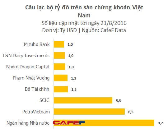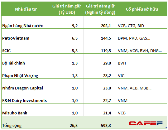 Thống kê mới nhất cho thấy hiện có 8 tổ chức và cá nhân đang sở hữu lượng cổ phiếu niêm yết trị giá từ 1 tỷ USD trở lên. Nhóm này bao gồm 1 cá nhân, 2 Bộ ngành, 2 doanh nghiệp 100% vốn nhà nước và 3 nhà đầu tư nước ngoài.