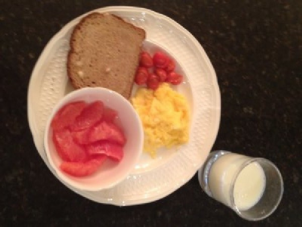 Thực đơn 4: Bánh mì; trứng trộn cà chua; một cốc sữa trộn ngũ cốc; trái cây tươi.