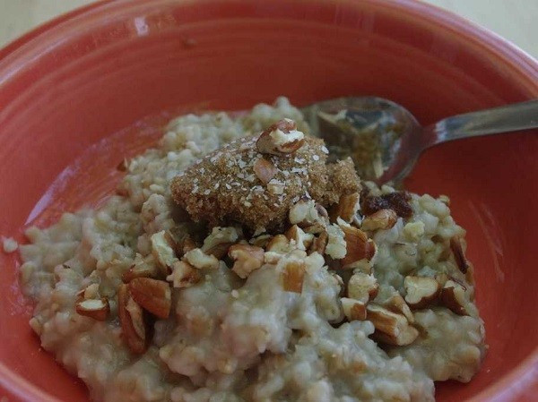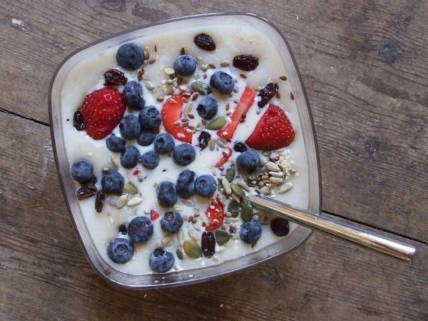 Thực đơn 7: Yến mạch chín trộn với sữa, trái cây, quả óc chó và một thìa sữa chua.