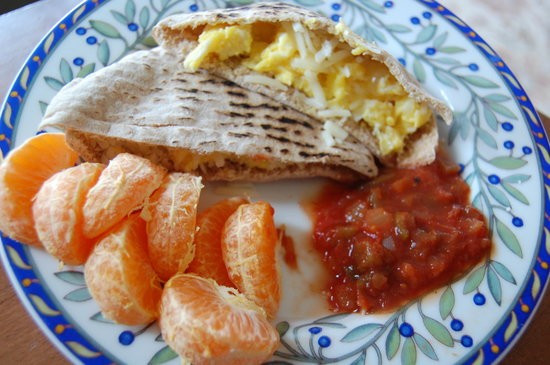Thực đơn 2: Bánh mì nhồi trứng, dầu ô liu, phô mai; trái cây tươi.
