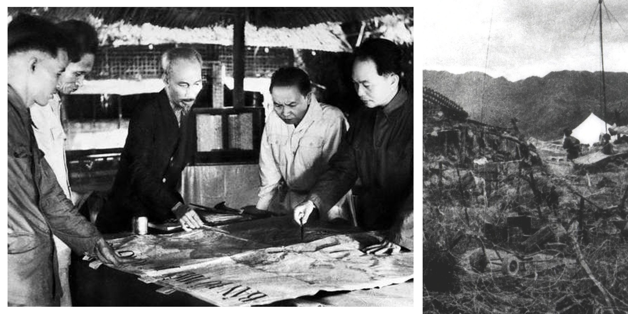 Chủ tịch Hồ Chí Minh và Đại tướng Võ Nguyên Giáp nghe kế hoạch chuẩn bị chiến dịch Điện Biên Phủ.
