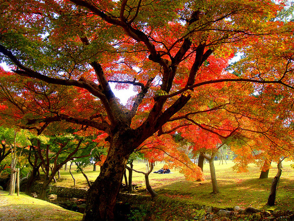 Thời điểm vào thu, cố đô nhỏ nhắn Nara nằm trong danh sách di sản thế giới này lại trở thành một công viên rộng lớn tràn ngập sắc màu. Hình ảnh những chú nai mắt to ngơ ngác đạp lên thảm lá vàng khô của công viên trải rộng trên 600 ha đẹp đến xao lòng. Dọc theo các con đường dẫn đến những ngôi đền, cung điện, rừng cây... được những hàng cây nhuộm trong sắc màu vàng, đỏ có thể mê hoặc bất kỳ du khách nào.