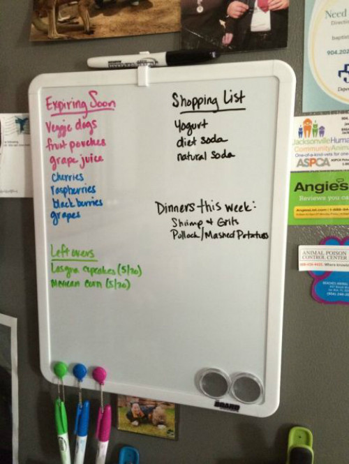 Phía ngoài cánh tủ lạnh, bạn có thể để một tấm bảng liệt kê những món đồ có bên trong, thực đơn... Danh sách này sẽ được cập nhật liên tục để bạn biết được loại thực phẩm nào cần mua thêm hoặc hạn sử dụng là khi nào...