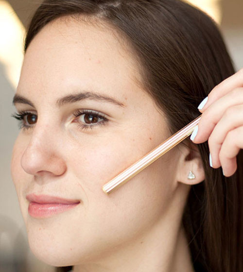 Để xác định nơi cao nhất của gò má, bạn cười mỉm hoặc sử dụng một cây bút, thước, cán chổi trang điểm...đặt trên má theo hướng chéo lên mang tai.