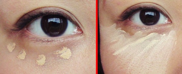 Nếu dùng che khuyết điểm dạng kem, các nàng chấm dưới quầng mắt rồi tán đều theo hướng chéo từ trên xuống dưới.