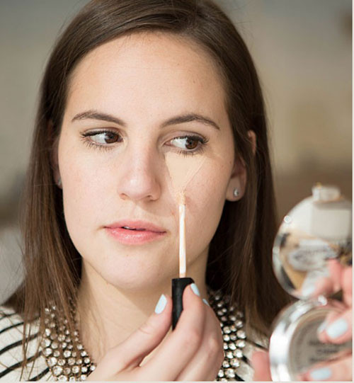Khi áp dụng che khuyết điểm dạng lỏng cho quầng mắt, bạn nên dùng chổi tạo hình tam giác ngược dưới mắt nhằm tăng hiệu quả cho việc giấu nhẹm nhược điểm trên da.