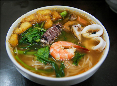 Một bát bún đầy đủ gồm mực tươi, cá tẩm bột chiên giòn, đậu rán, rau cải xanh với nước dùng kiểu lẩu Thái - đây được xem là điều hấp dẫn món ăn hơn cả. Để tiết chế vị cay, chủ quán thường sử dụng thêm me, gừng, sả và chế biến theo công thức riêng. Nhờ đó, bát bún vẫn hợp với những người không quen vị cay của đồ Thái.