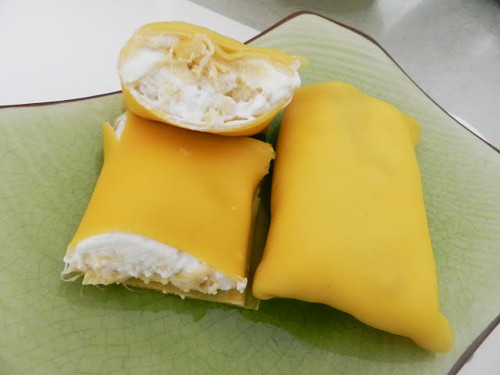 Thành phần món bánh này là kem tươi, sầu riêng và bột mỳ. Lớp vỏ vàng tươi từ bánh crepe, phần nhân béo ngậy thơm mùi sầu riêng đầy hấp dẫn.