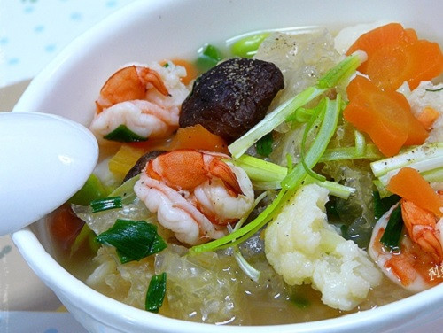 Canh bóng không chỉ ngon mà còn hấp dẫn thực khách bởi màu sắc sinh động: Đỏ của cà rốt, xanh bông cải xanh và đậu Hà Lan, trắng trong của bóng bì, nâu sậm của nấm hương, vàng của chả cá...