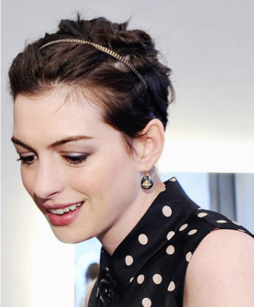 Anne Hathaway tô đậm cho nét cá tính của bản thân bằng chiếc băng đô dạng răng cưa kết hợp đeo hoa tai sắc đen sang trọng.
