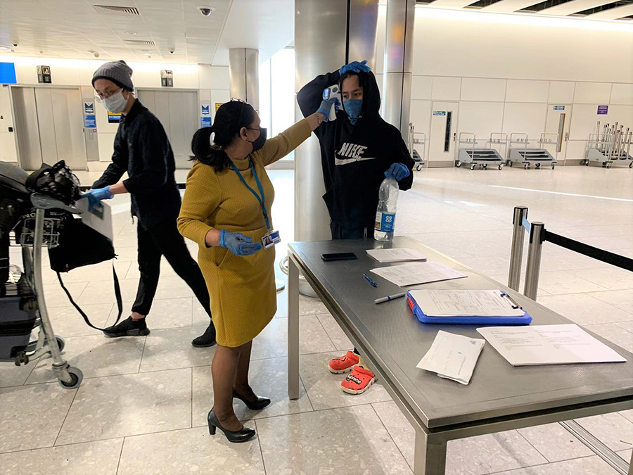 Công dân Việt Nam tại Anh được kiểm tra y tế trước khi lên chuyến bay về nước. Ảnh: VNA.