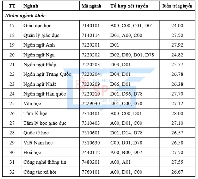Đối với nhóm ngành khác, điểm chuẩn cao nhất thuộc về ngành Tâm lý học 28 điểm. Ngoài ra, mặc dù là năm đầu tiên tuyển sinh nhưng ngành Giáo dục học cũng có mức điểm trúng tuyển khá cao 24 điểm.
