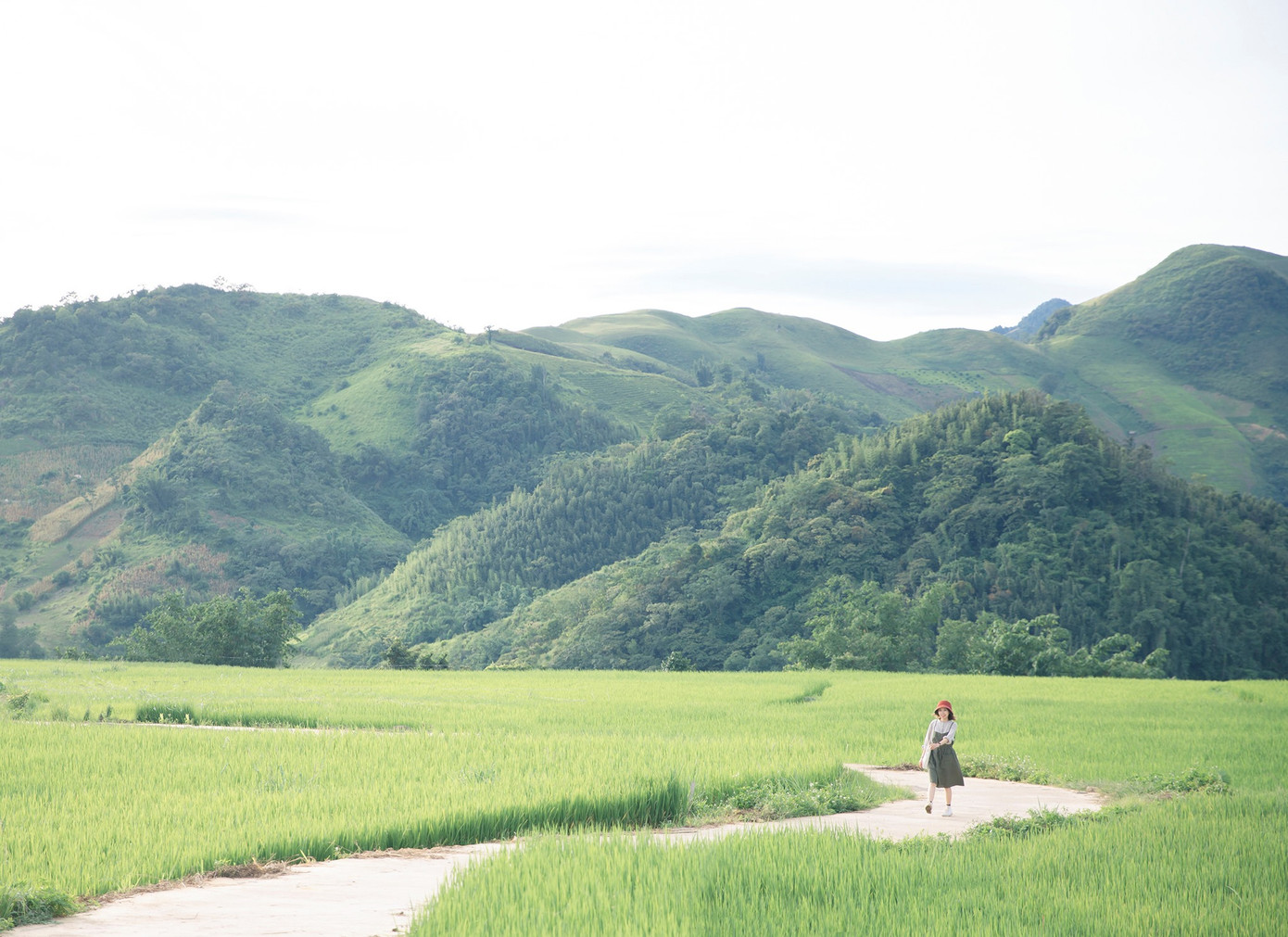 | Hoài Thương khám phá vẻ đẹp Mộc Châu với ruộng bậc thang đang vào mùa xanh mượt. |