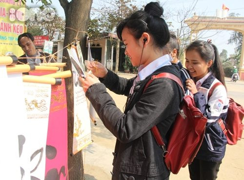 Dịp Tết những năm gần đây, làng Cổ Đạm (huyện Nghi Xuân, Hà Tĩnh) thêm phần đặc biệt khi trong làng có sự xuất hiện của “ông đồ” chỉ mới 20 tuổi. Mọi người cùng chen nhau xin chữ, xin tranh của cậu bạn Hoàng Trung Thành, sinh viên năm 2 Đại học Kiến trúc Hà Nội, làm cho không khí tết ở đây náo nhiệt hơn. Tranh thủ thời gian nhàn rỗi dịp nghỉ Tết, Thành đã dùng biệt tài viết thư pháp để kiếm thêm thu nhập.