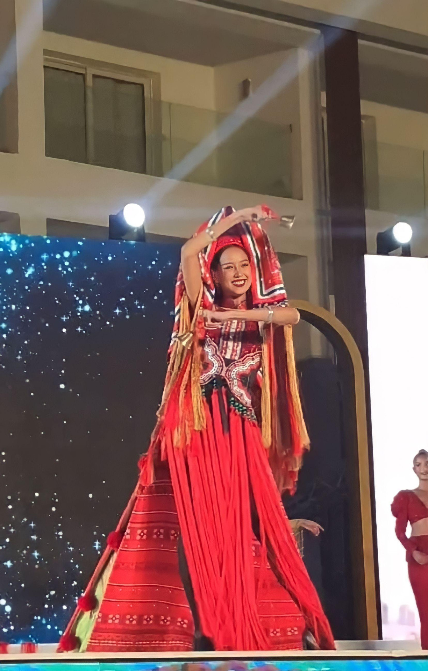 Với sắc đỏ - vàng - xanh vô cùng nổi bật, với điểm nhấn là phần tà áo mang hình ảnh giống chiếc quạt xè đầy màu sắc. Trong phần thi vừa rồi, Bảo Ngọc đã có phần thể hiện vô cùng xuất sắc thổi hồn cho bộ trang phục khiến cho các Fan sắc đẹp phải tấm tắc khen ngợi về thần thái đến cách trình diễn đậm chất của người con gái dân tộc Dao của Việt Nam.
