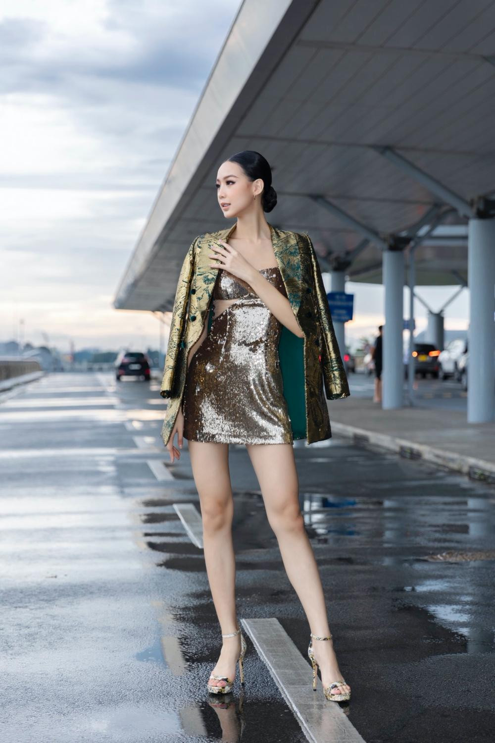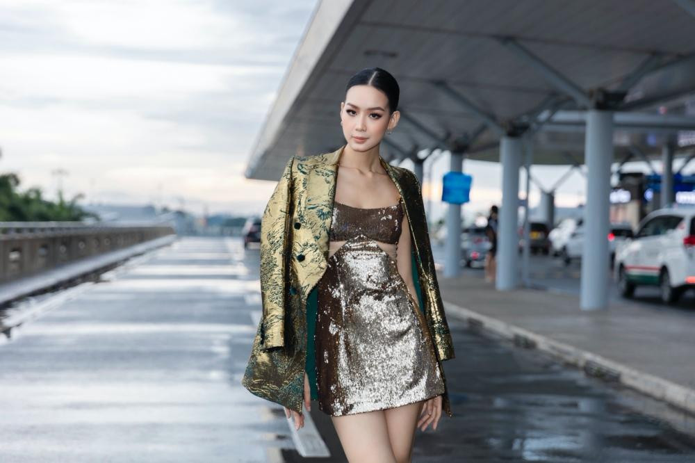 Á hậu Bảo Ngọc diện thiết kế cocktail lấp lánh, kèm áo khoác với họa tiết màu vàng đồng. Với 125 kg hành lý, trang phục của Bảo Ngọc tại cuộc thi lần này hứa hẹn sẽ khiến fan sắc đẹp trong nước và quốc tế phải xuýt xoa.